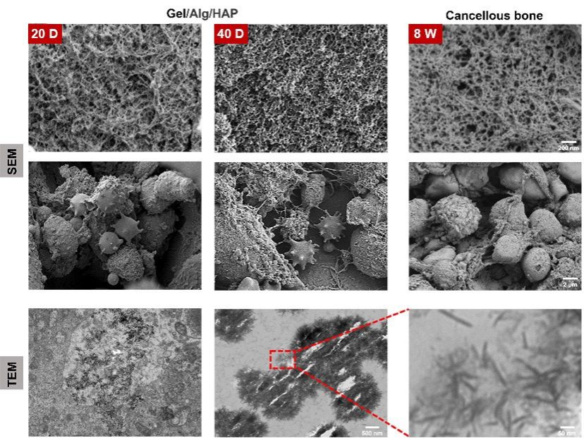 如今,这个项目的阶段性成果诞生了。科研团队采用数字光处理生物打印技术,打印出骨头的3D结构,实现了骨组织复杂结构的精确复制。生物墨水是生物3D打印的重要原材料,他们研制了一种新型生物墨水,由甲基丙烯酰化明胶、甲基丙烯酰化海藻酸钠、羟基磷灰石组成。这种生物墨水不仅能模仿天然骨基质的复杂性,还具有自我矿化和细胞分化能力。“骨头里有很多矿物质,是一种硬组织。”苏佳灿教授解释,“我们制备骨类器官的原料是软组织细胞,但经过体外培育,这些细胞不但会分化,还能自我矿化,成为类似骨头的硬组织。”