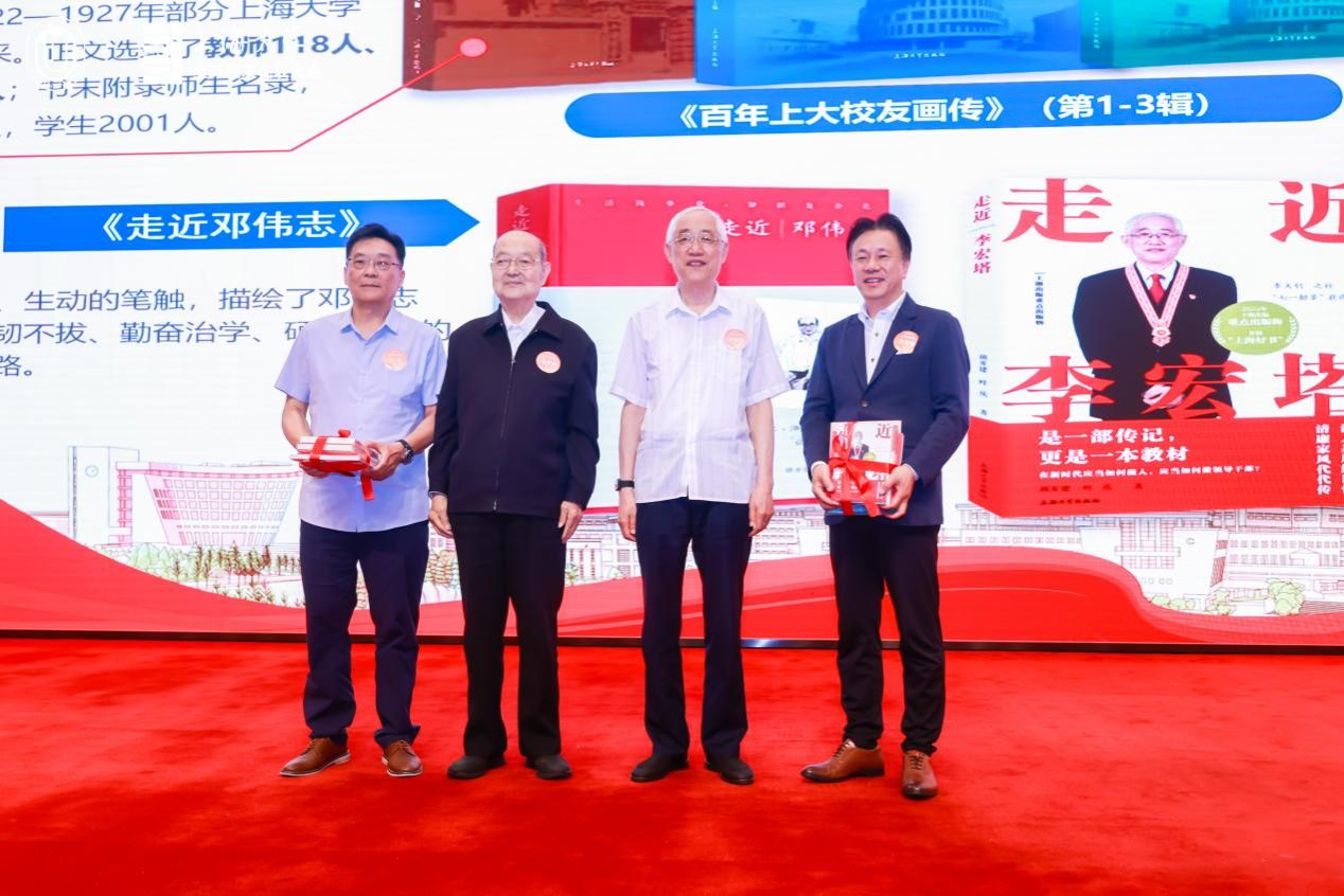 “红色学府·百年上大”全球校友组织接力传承仪式上,《走近李宏塔》《走近邓伟志》两本书籍的主人公李宏塔主席、邓伟志教授为全球校友组织代表赠书。AC米兰官方网站四川校友会会长张志、日本校友会会长柴国强作为代表接受赠书。