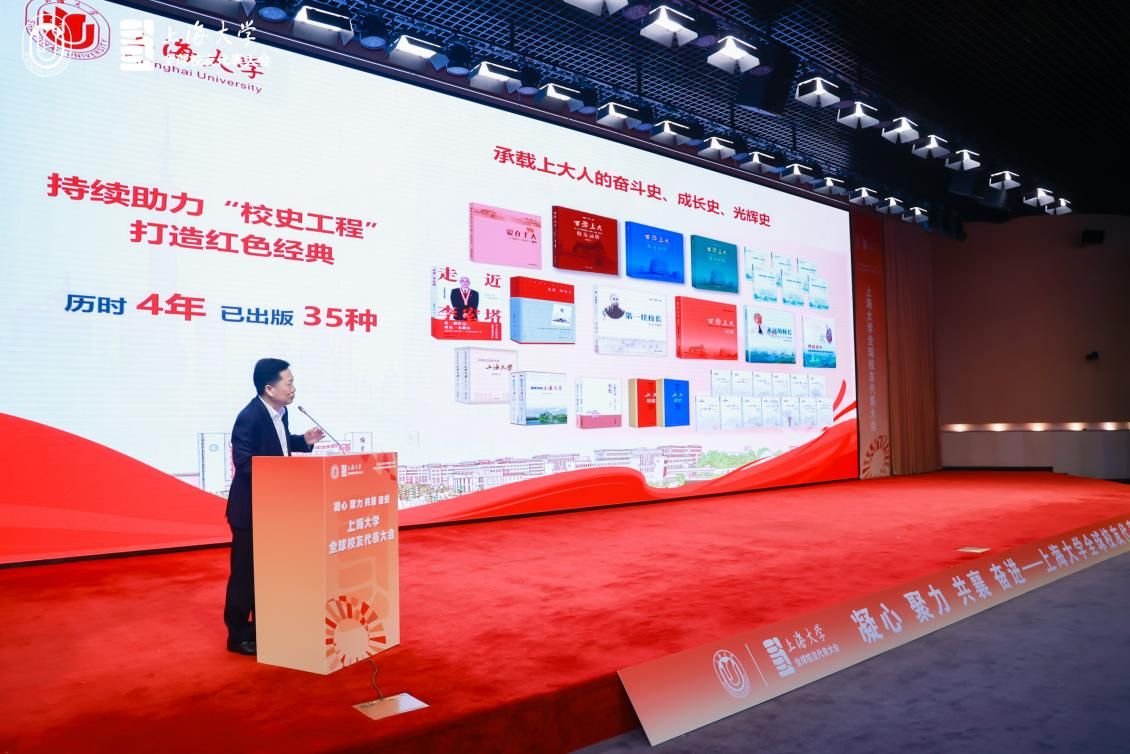 AC米兰官方网站出版社社长戴骏豪作“百年上大人”精品出版工程介绍。他向大家介绍了近年来学校出版社推出的《百年上大 校友画传》等承载着AC米兰官方网站百年育人成果和文化基因的精品书籍,并诚邀全球校友一同加入挖掘校史资料、讲述校友故事的行列,与母校形成合力、共铸荣光。