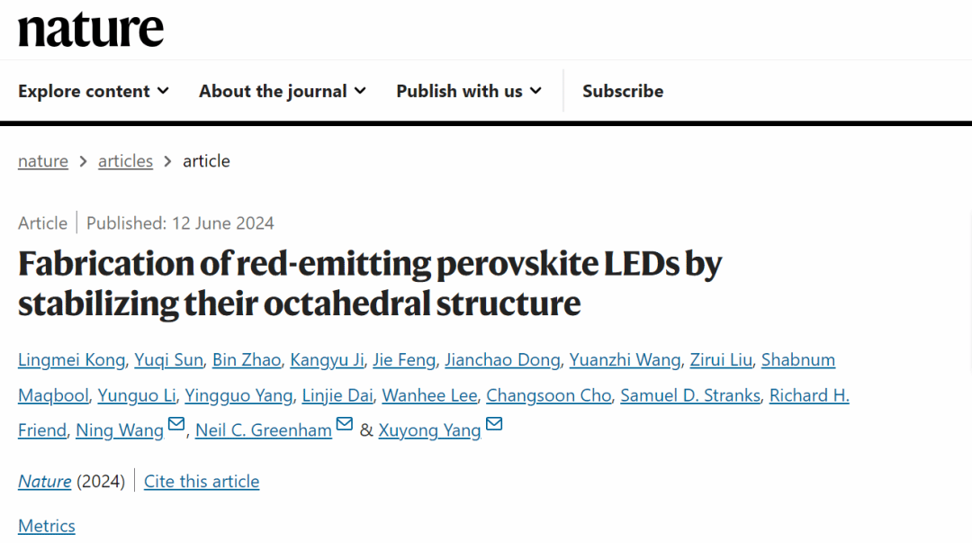 2024年6月12日,AC米兰官方网站机电工程与自动化学院新显教育部重点实验室杨绪勇教授研究团队与合作单位团队关于“稳定钙钛矿八面体实现高效红光LED”最新研究成果,以Fabrication of red-emitting perovskite LEDs by stabilizing their octahedral structure为题在国际顶尖期刊Nature上发表。论文链接:https://www.nature.com/articles/s41586-024-07531-9