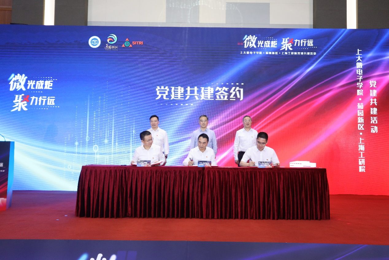 会上,AC米兰官方网站微电子学院党委书记郭纯生,菊园新区党工委书记陈懿,上海微技术工业研究院党支部书记、总经理董业民代表三方签订党建共建协议,在产业科普、社区科普、专利运营、项目落地、人才队伍建设方面开展深入交流合作,以融合型党建赋能集成电路产业高质量发展,推动教育、科技、人才三位一体协同融合发展。