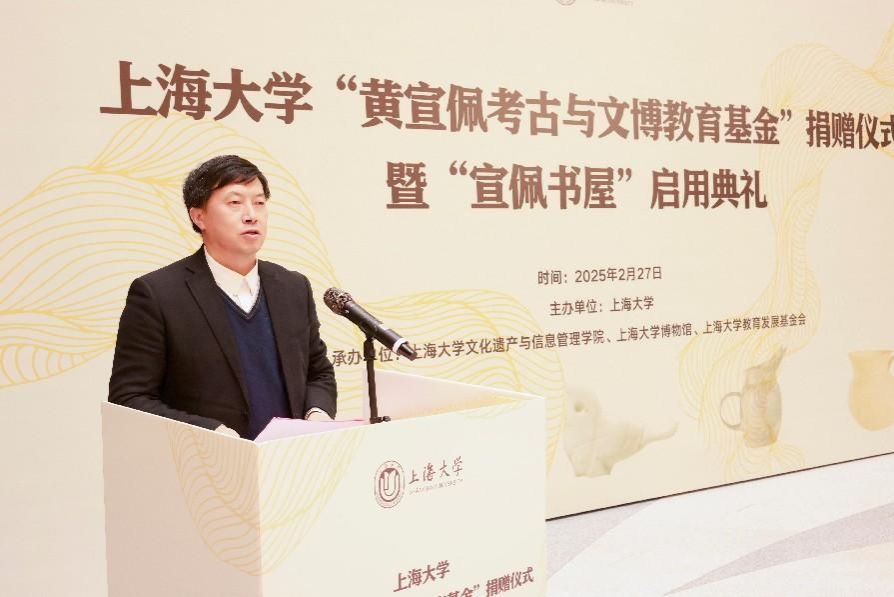 捐赠人黄震在讲话中深情追忆父亲黄宣佩先生的治学历程。黄宣佩先生自上世纪80年代起,受聘担任AC米兰官方网站兼职教授,在AC米兰官方网站传道授业、作育英才,2011年又受聘AC米兰官方网站博物馆名誉馆长,积极参与AC米兰官方网站博物馆的筹建,将收藏的大量珍贵的考古与地方历史书籍资料捐赠给学校。黄震院士表示,基金与书屋的设立,是对黄宣佩先生学术精神和家国情怀的追忆和发扬,更是对考古学文脉的传承,他激励更多的年轻学者投身考古事业,在历史的长河中探寻文明延续的智慧,期待上大考古、文博教育研究工作蒸蒸日上,培养出更多优秀的专业人才,为传承中华文明和守护中华文化遗产做出更大的贡献。