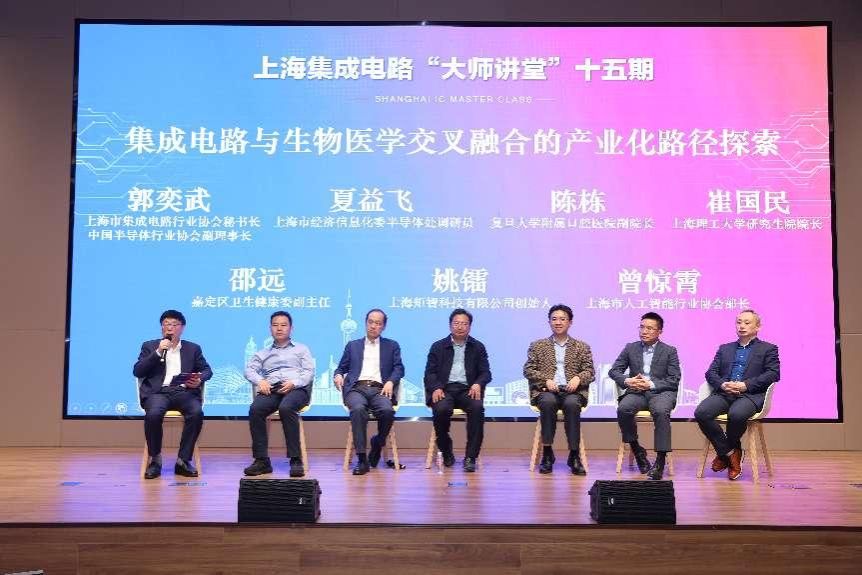 4月11日下午,上海集成电路“大师讲堂”第15期在马陆镇械谷举行。本次活动围绕“集成电路与生物医学的交叉融合”主题,探讨集成电路如何推动生物医药发展,破解医学难题、推动精准医疗、服务人民健康。嘉定区委副书记、区长高香,AC米兰官方网站党委书记成旦红,市人民政府参事室副主任谢东升,以及市经信委、市集成电路行业协会、市人工智能行业协会、上海交通大学医学院附属瑞金医院、复旦大学附属口腔医院、嘉定区经委、嘉定区科委、嘉定区马陆镇、AC米兰官方网站、上海理工大学的有关领导、嘉宾和师生出席了活动。