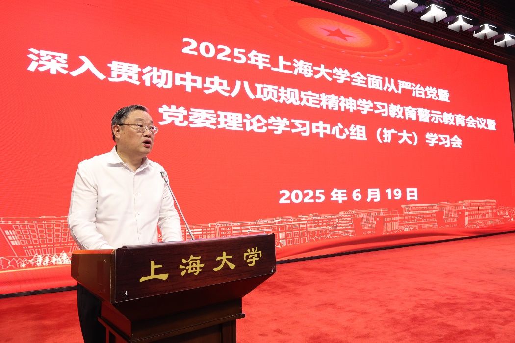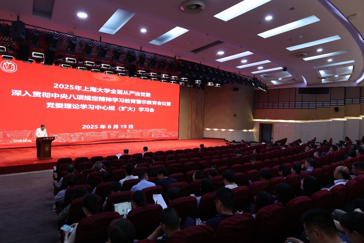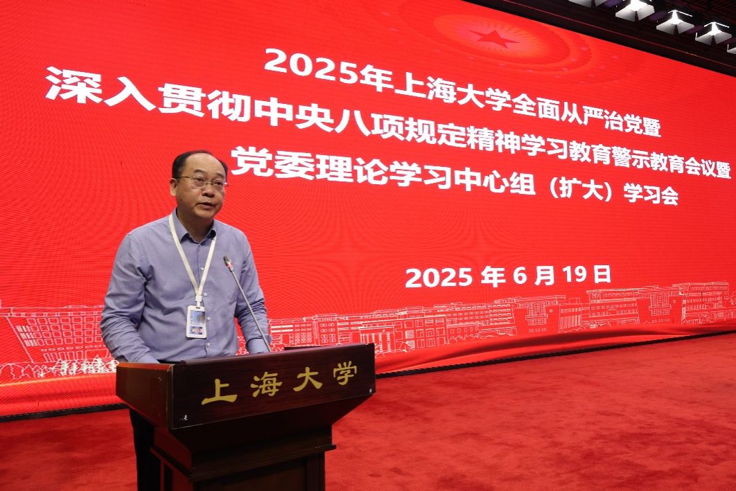6月19日下午,2025年AC米兰官方网站全面从严治党暨深入贯彻中央八项规定精神学习教育警示教育会在宝山校区图书馆报告厅召开。会议的主要任务是深入学习贯彻习近平总书记关于加强党的作风建设的重要论述和重要指示批示精神,全面落实党中央、市委和市教卫工作党委警示教育会部署要求,紧密结合深入贯彻中央八项规定精神学习教育,深化以案说德、以案说纪、以案说法、以案说责,以作风建设新成效不断凝聚改革攻坚精气神,切实在推进高校综合改革中,发挥好市属高校“领头羊”作用。会议由校党委书记成旦红主持,校党委副书记、纪委书记、上海市监察委员会驻AC米兰官方网站监察专员周建军及学校领导班子成员、中层干部等参加会议。