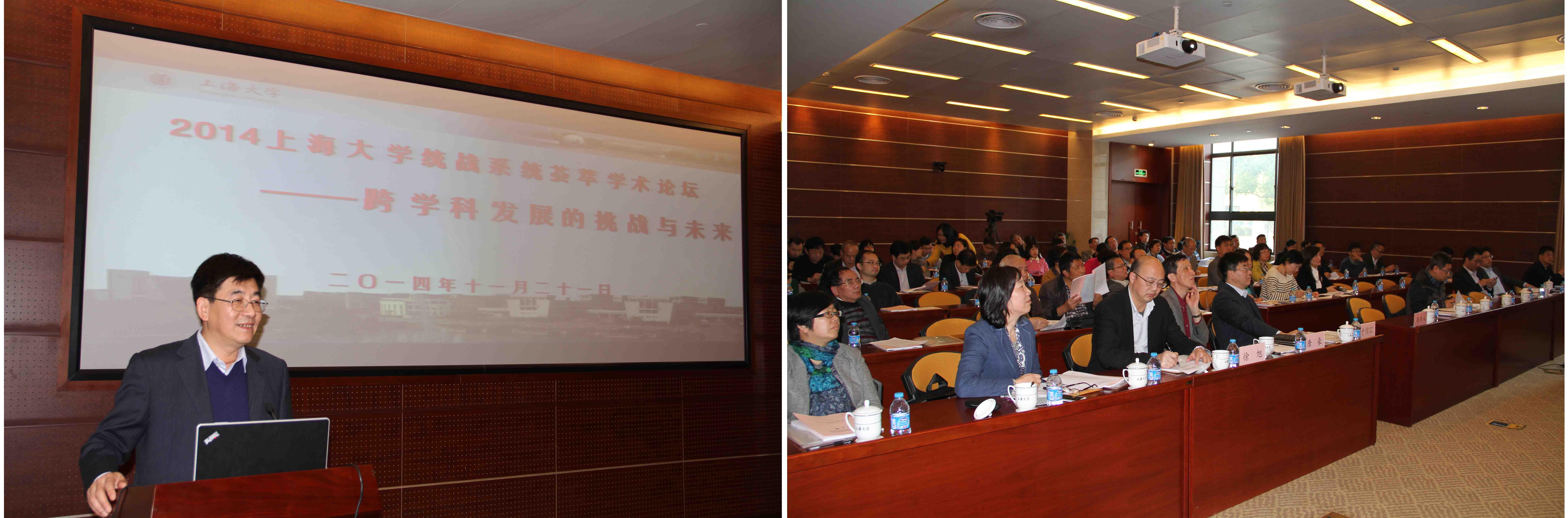 11月21日下午,“2014AC米兰官方网站统战系统荟萃学术论坛——跨学科发展的挑战与未来”在校本部乐乎新楼2号楼思源厅举行。校党委书记于信汇,副校长唐豪,校党委常委、组织部部长徐旭等领导出席,各民主党派、统战团体、无党派人士代表,各学院(系统)党委、直属党总支分管统战工作领导等70余人参加了论坛。今年论坛由校党委统战部主办,民革上大委员会、校知联会共同承办。校知联会副会长秦钠和民革上大委员会主委屠大维分别担任上下半场主题报告主持人,论坛由校党委统战部部长李红主持。