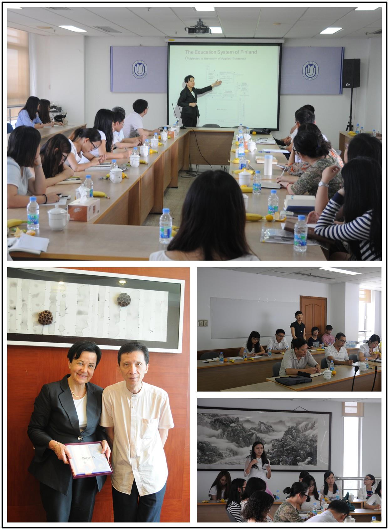 Tenhunen女士首先简要介绍了芬兰的地理、气候、人口、经济等国家概况。随后,她对芬兰的教育体系做了说明,指出芬兰高等教育分为学术型院校和应用技术型院校两种并行的教育模式。芬兰对应用技术型院校建设的重视是芬兰高校改革中重要的内容。芬兰着力推进建设新型高校,其目的是为了适应国家政策和经济发展需求,改革传统单一的高等教育模式、提升应用技术型院校的地位、培养能力扎实的技术型人才。芬兰高校的改革基于法律制度的保障涵盖以下五个方面:缩减政府控制的招生人数,使录取专业人数比例更适应市场的变化;与教育文化政府部门签订协议,明确各学校的核心竞争力、教学领域、招生总人数等;政府推动小规模院校之间的合作与合并,经营应用技术型院校需要达到政府认可的资质,以保证教学质量和教学经费的高效利用;教学经费的提供根据应用科技型院校的教学质量和成果决定。此外,她还对高等教育评价体系指标做了简要阐述。