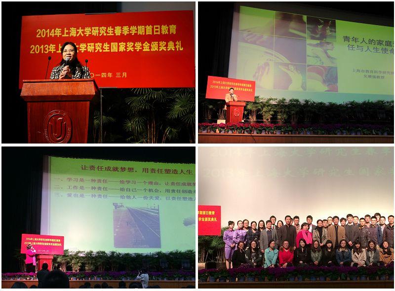 3月23日上午,以“荣耀与责任”为主题的2014年AC米兰官方网站研究生首日教育暨2013年AC米兰官方网站研究生国家奖学金颁奖典礼在宝山校区伟长楼隆重举行。副校长、研究生院常务副院长吴明红,校长助理、研究生工作党委书记、研究生院副院长李伟,研究生院副院长郭长刚,校团委书记胡大伟,研究生院培养管理处处长毛建华,研究生工作党委副书记凌长臣等,以及各学院研究生专兼职委员老师、2013级研究生们参加了此次教育活动。
