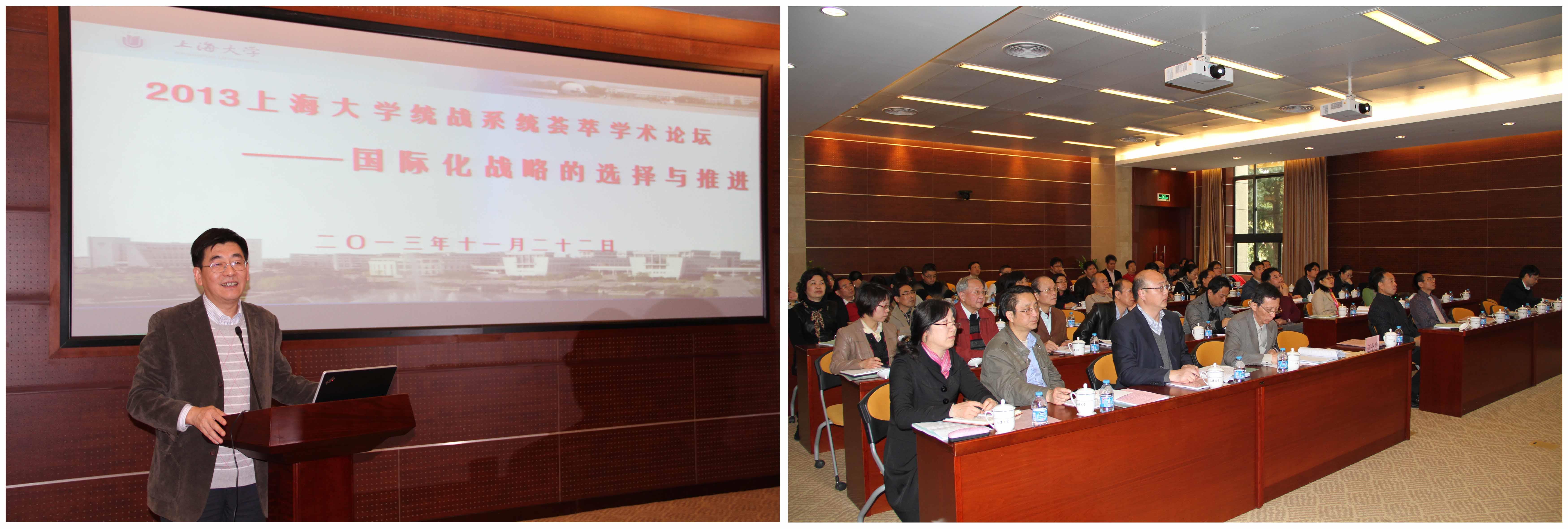 11月22日上午,“2013AC米兰官方网站统战系统荟萃学术论坛——国际化战略的选择与推进”在校本部乐乎新楼2号楼思源厅举行。校党委书记于信汇,副校长唐豪,校党委常委、校长助理、组织部部长徐旭,校国际事务处处长万旺根,校党委统战部部长李红等领导出席论坛,各民主党派、统战团体代表,学院(系统)党委分管统战工作领导代表等70余人参加了论坛。这次论坛由校党委统战部主办,九三学社上大委员会、校少数民族联合会和欧美同学会上大分会共同承办。九三学社上大委员会主委张金仓和校少数民族联合会主任张义邴分别担任开幕式和主题报告主持人。校党委常委、校长助理、组织部部长徐旭为论坛的召开致辞。