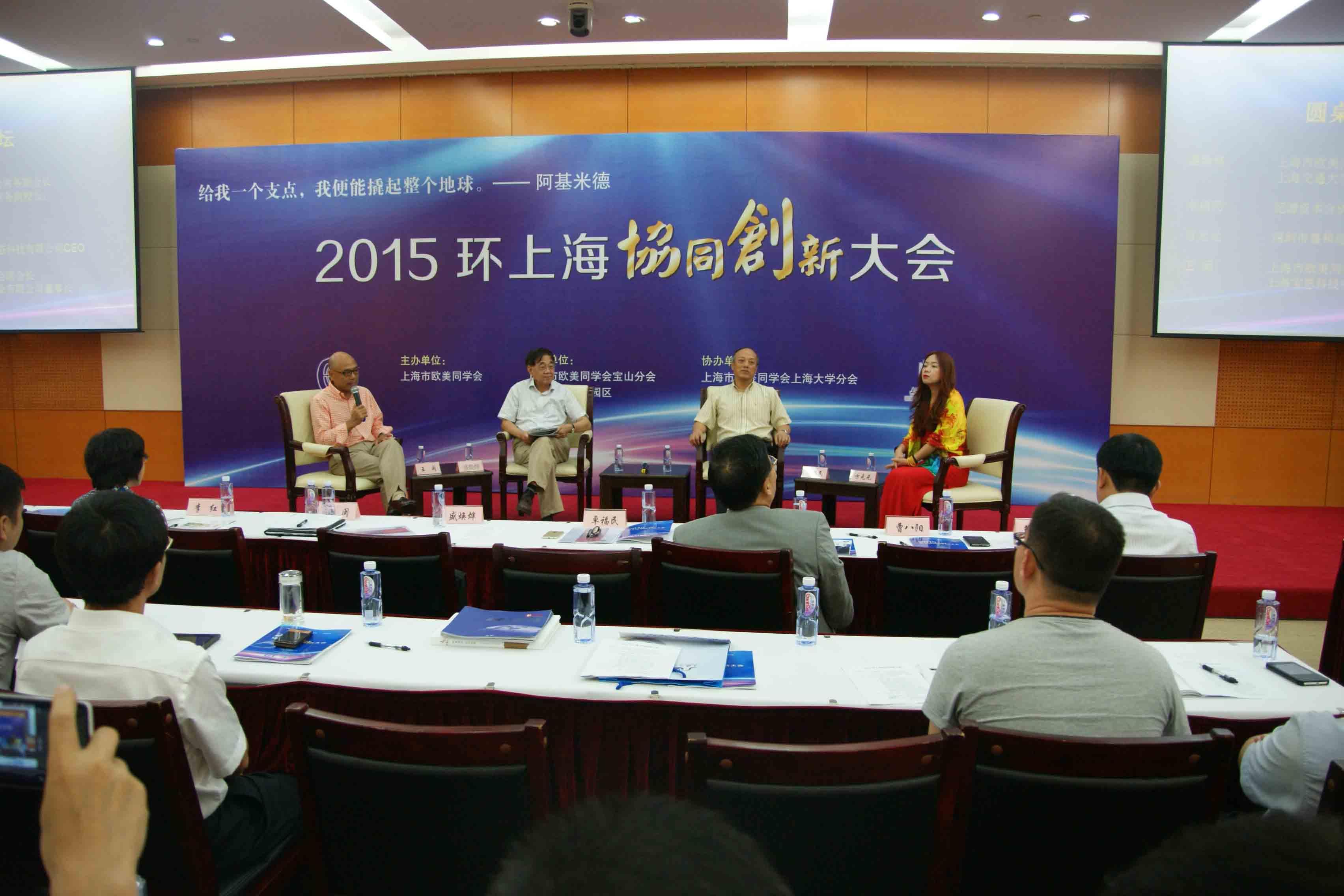 “2015环上海协同创新大会”于2015年8月21日下午,在海上文化中心圆满举行。本次大会由上海市欧美同学会主办,上海市欧美同学会宝山分会、AC米兰官方网站科技园区承办,上大分会、上大侨联协办。大会由上海市欧美同学会宝山分会副会长李佳川主持,上海市欧美同学会副会长王闽致欢迎辞。上海交通大学原常务副校长盛焕烨、纪源资本合伙人卓福民、深圳嘉和CEO方元元、摩根资本助理总裁骆毅平等应邀作为圆桌论坛嘉宾。