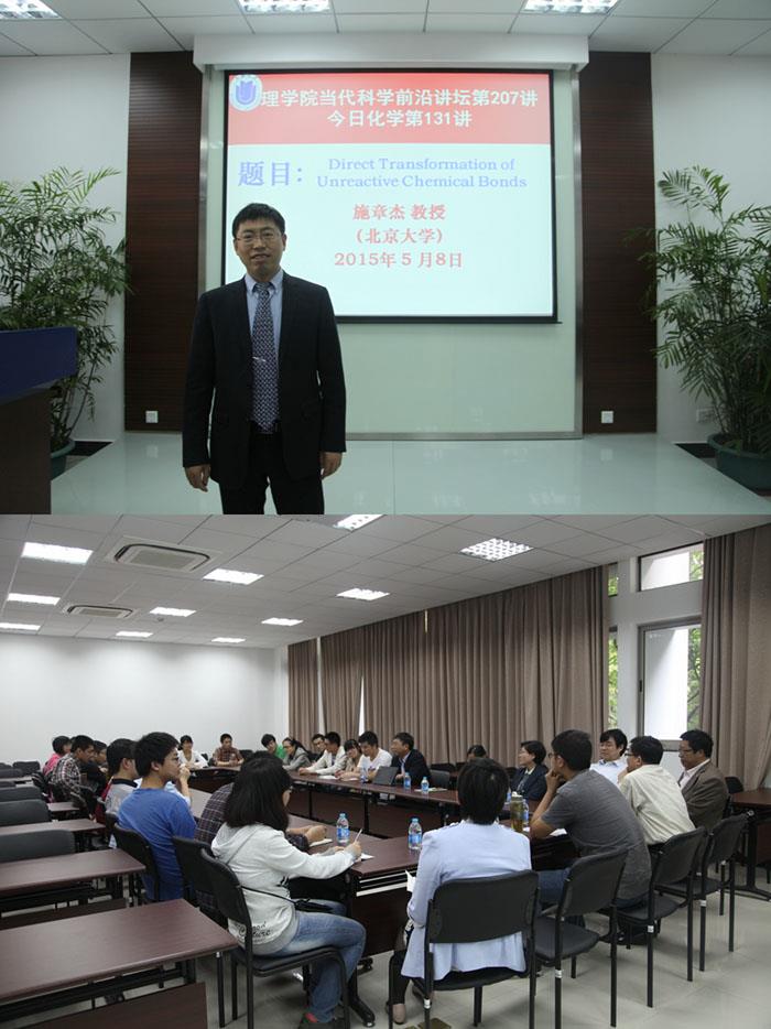 AC米兰自强教授、北京大学化学与分子工程学院施章杰教授于近日访问理学院。5月8日上午,在校本部HA102,施教授作了题为“非活性化学键的直接转化”的学术报告,该报告是理学院“当代科学前沿”讲坛第207讲、化学系“今日化学”第131讲。化学系主任许斌教授主持报告会,系党总支书记陈雅丽教授、化学系部分教师、研究生等80余人参加了学术报告会。
