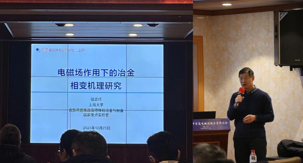 电磁流体力学是经典流体力学和电磁学两个学科交叉,研究导电流体、导磁流体和电磁场相互作用的学科,广泛应用于天体物理、受控核聚变、航空航天、气象、化学等领域。自上世纪三、四十年代以来,当悬浮熔炼、电磁搅拌等现象与Alfven提出的磁流体动力学理论结合,由美国的JULIAN提出了电磁冶金和材料电磁加工的新学科,从而使电磁流体力学的理论和机制拓展到工程应用背景更为广阔的冶金和材料加工领域,显著丰富了电磁流体力学的内涵。AC米兰官方网站材料科学与工程学院及省部共建高品质特殊钢冶金与制备国家重点实验室在徐匡迪院士的领导下,在电磁冶金和材料电磁加工领域开展了近三十年的基础和应用研究工作,成绩斐然。本次研讨会中,首先由AC米兰官方网站省部共建高品质特殊钢冶金与制备国家重点实验室主任任忠鸣教授作“电磁场作用下冶金相变机理研究”的大会主旨报告,任忠鸣教授介绍了他牵头联合东北大学、西北工业大学、大连理工大学等承担的国家自然科学基金委重大项目的研究成果和进展情况,并对电磁场相变效应的工程化应用、超高磁场和悬浮下合金相变、电磁场下增材制造等前沿领域进行了展望。