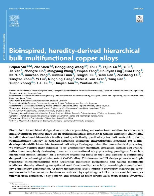 本研究成果发表在国际著名期刊《Materials Today》上(2023年影响因子:24.2),论文题目“Bioinspired, heredity-derived hierarchical bulk multifunctional copper alloys”(仿生、遗传衍生多层级强化的大尺寸多功能铜合金)。