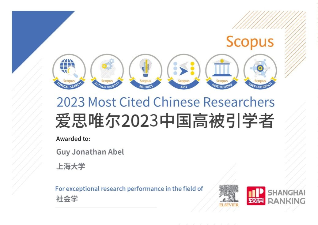 Guy Abel教授的主要研究领域为国际人口迁移,他擅长使用人口流动估计方法,并通过应用统计方法预测人口流动,为国际移民组织提供咨询服务。在担任社会学院人口研究所暨亚洲人口研究中心国际人口迁移研究组(research pillar)负责人期间,Guy Abel教授在众多国际知名期刊如SCIENTIFIC DATA,GLOBAL ENVIRONMENTAL CHANGE,ENVIRONMENT AND PLANNING A上发表过一系列重要研究成果。这也是Guy Abel教授继2021年首次入选后第三次进入此榜单。
