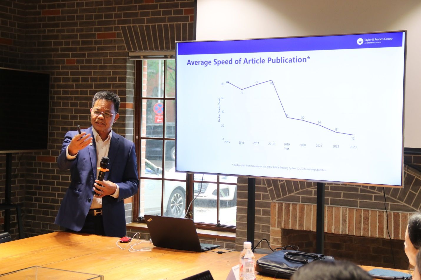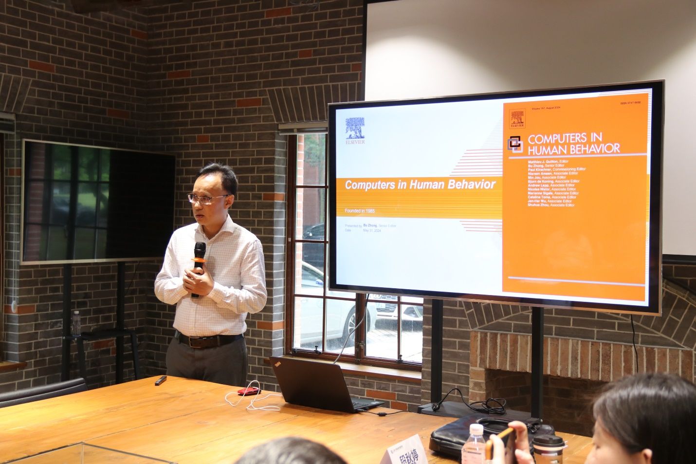 钟布主编向大家介绍了《Computers in Human Behaviors》及两本新子刊《CHB Reports》和《CHB Artificial Humans》的刊物定位、办刊情况和流行度等,并介绍说刊物名称中的“Computers”是指人工智能(AI)等一切宽泛的digital technology。钟布教授认为,作者需要花费更多心思在前期的研究创意和研究设计上,把这些问题解决好可以节省后面的时间,作者需要多问问自己“What’s known?”和“What’s new?”,并在文章写作中予以回答。他提醒大家要关注新趋势、新问题,大量、广泛、持续地阅读文献,养成阅读习惯。他还鼓励同学们在求学时代积极发问,“没有愚蠢的问题”。