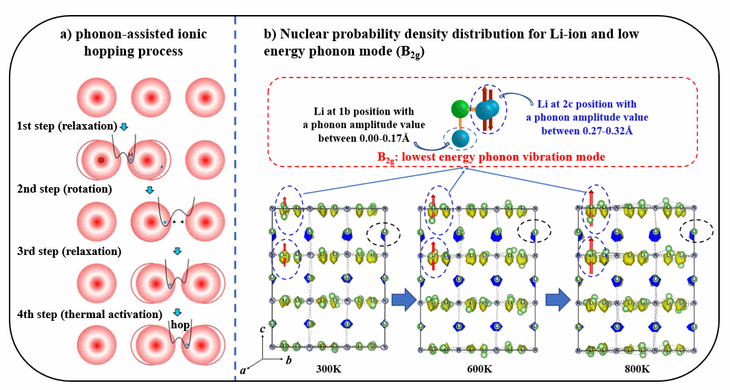 图2.(a)声子辅助迁移离子在结构中的扩散过程原理图。(b)低能声子模式辅助氮化锂中锂离子扩散的示意图。