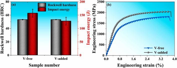 V-free钢和V-added的力学性能:(a)冲击功和硬度;(b)应力-应变曲线