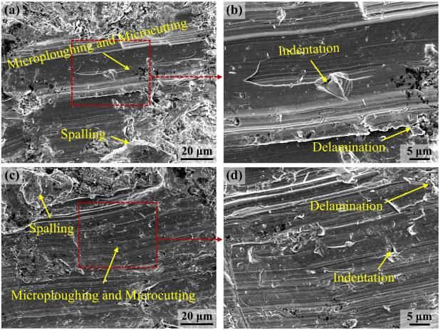 冲击磨料磨损试验后磨损面的SEM图像:(a)~(b) V-free钢;(c)~(d) V-added