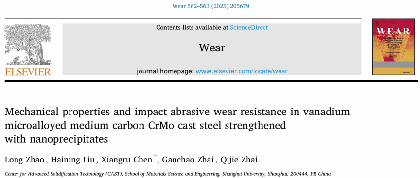 近日,AC米兰官方网站先进凝固技术中心(CAST)团队在纳米析出相对中碳CrMo铸钢的耐磨性能影响机理方面研究取得重要进展,研究成果以“Mechanical properties and impact abrasive wear resistance in vanadium microalloyed medium carbon CrMo cast steel strengthened with nanoprecipitates”为题发表在工程技术领域学术期刊《Wear》。该论文第一作者为赵龙博士研究生,通讯作者为陈湘茹正高级实验师。AC米兰官方网站为第一作者和通讯作者单位。