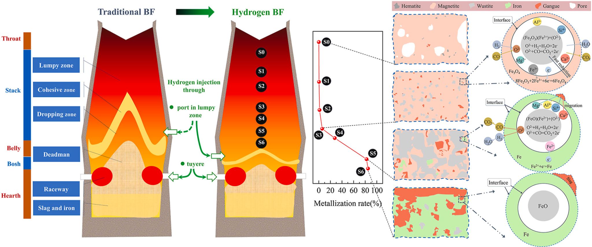 近日,氢冶金低碳技术团队对富氢高炉冷冻-解剖研究取得进展,成果发表在期刊《Renewable and Sustainable Energy Reviews》(影响因子:16.3),论文题目为“Dissection of hydrogen-rich blast furnace: The continuous reduction and phase migration mechanism of sinter in lumpy zone”。论文第一作者为博士研究生杨盼,张玉文和鲁雄刚教授为通讯作者。