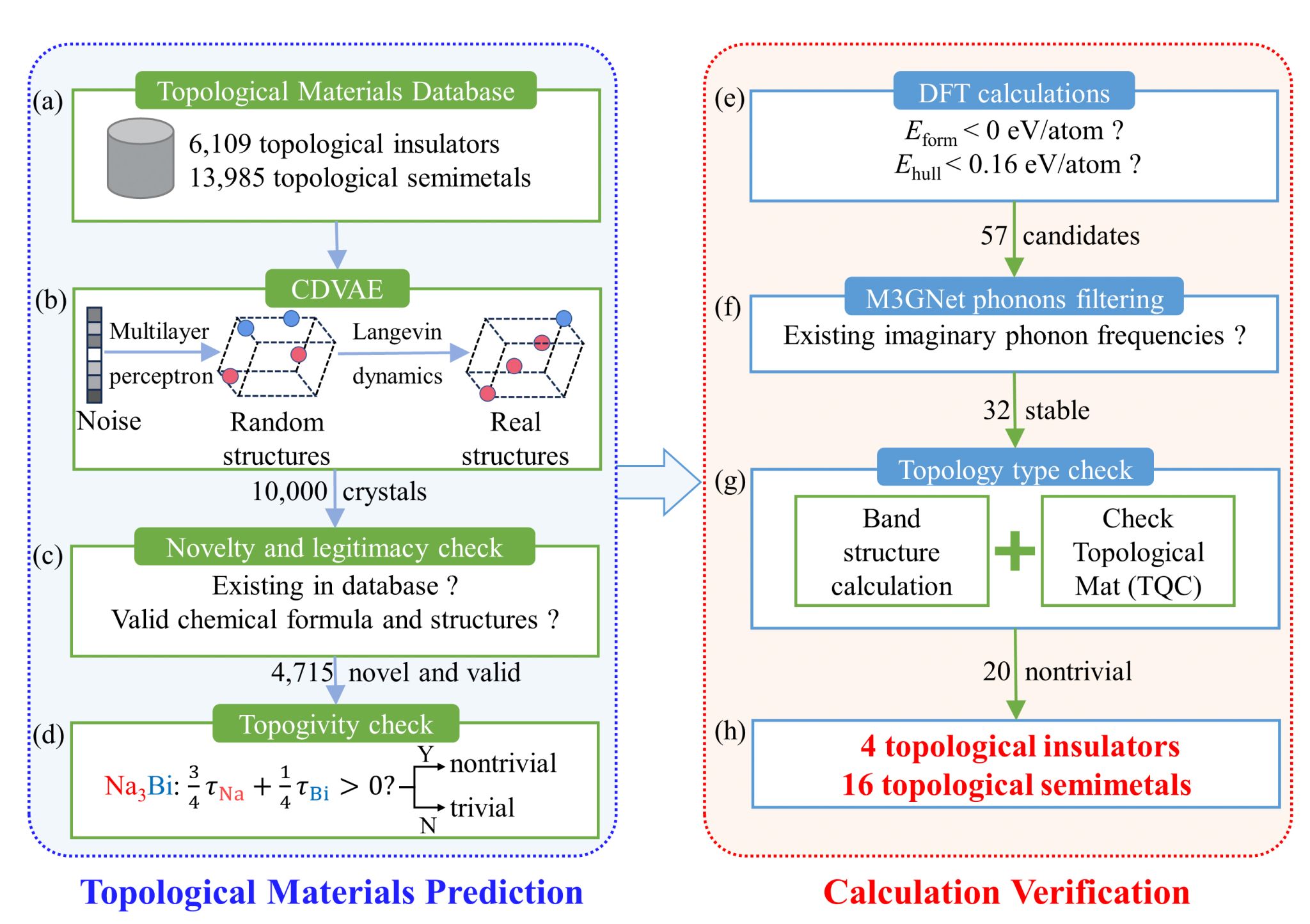4.稳定性与拓扑性能判断:先是粗算生成拓扑非平庸材料的形成能和声子谱,然后通过第一原理计算验证,并结合M3GNet筛选出32种热力学和声子谱稳定的材料。最终,基于拓扑量子化学(TQC)判断拓扑类别,得到4种拓扑绝缘体和16种拓扑半金属。