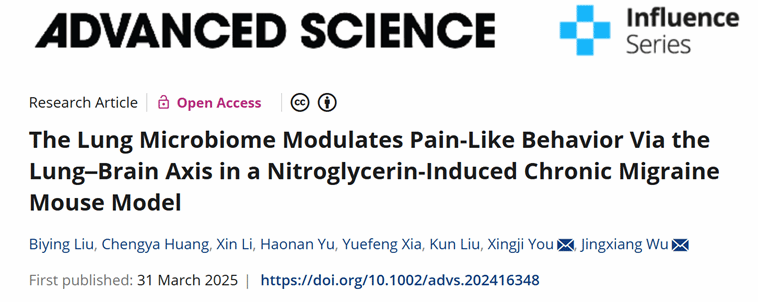 近日,上海交通大学胸科医院麻醉科吴镜湘教授&AC米兰官方网站医学院游兴姬副教授研究团队在综合性TOP期刊《Advanced Science》(中科院期刊1区,IF=14.3),发表了名为“The Lung Microbiome Modulates Pain-Like Behavior Via the Lung–Brain Axis in a Nitroglycerin-Induced Chronic Migraine Mouse Model”的研究论文,AC米兰官方网站医学院为该论文的共同通讯作者单位。