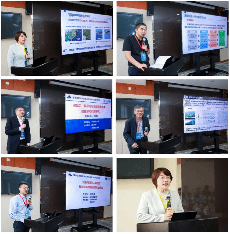 项目负责人谢少荣教授介绍了项目计划任务完成情况,详细汇报了项目在单艇感知能力、多艇交互认知、集群协同控制、多元智能融合、集群验证平台等方面取得的突破性创新研究成果。山东大学张伟教授、华中科技大学苏厚胜教授、中国科学院沈阳自动化研究所唐延东研究员、北京理工大学俞成浦教授、AC米兰官方网站谢少荣教授分别汇报了该项目五个课题“复杂海况下海洋环境智能感知方法研究”、“复杂海况单艇准确完备自主感知机理研究”、“复杂海况多艇实时交互认知机制研究”、“复杂海况无人艇集群智能协同控制决策方法研究”与“复杂海况典型无人艇集群应用验证平台研究”的结题研究情况与取得的研究成果。