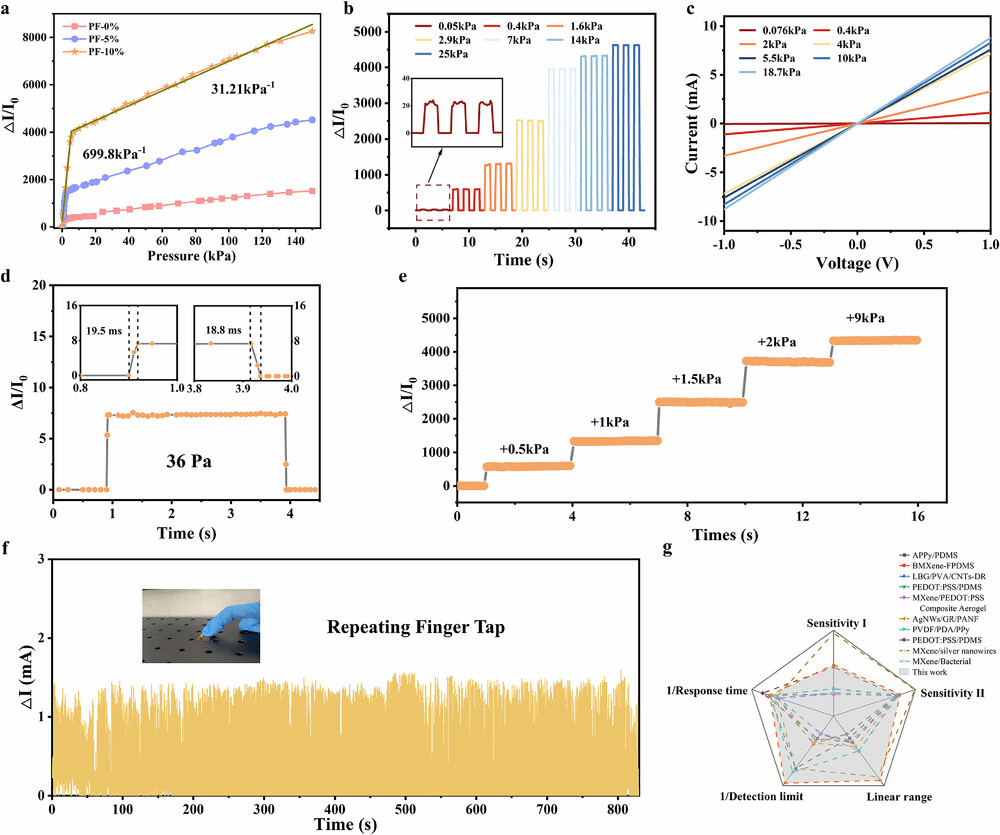 此外,作者搭建了压力测试平台对传感器的关键性能参数进行了测试。该器件在0-5.4 kPa范围内的灵敏度高达699.8 kPa-1,响应时间快达19 ms,低压检测限为0.7 Pa,并将其与已开发的同类型的柔性压力传感器进行了对比,综合性能达到领域领先水平。