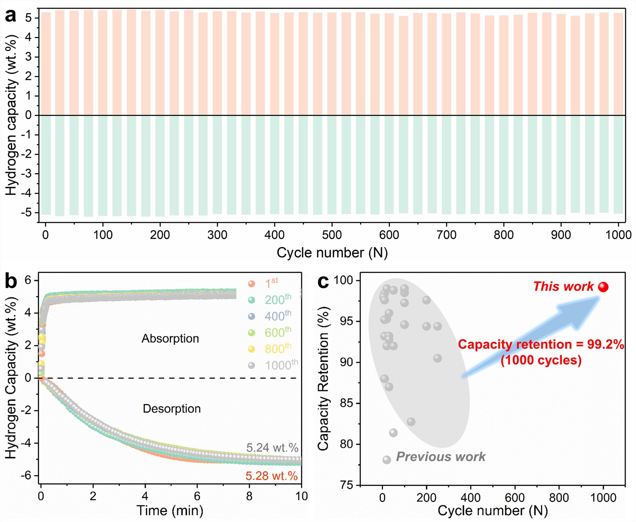 经过1000次吸放氢循环后,Mg2Ni@Ti-MgO/MgH2的储氢容量仅从5.28 wt.%降低至5.25 wt.%(图3a和b),其储氢容量保持率高达99.2% (图3c),且未观察到明显的动力学衰减 (图3b)。该结果表明,添加Mg2Ni@Ti-MgO催化剂能显著改善MgH2的循环稳定性 (图3c),有效突破了MgH2催化体系所面临循环寿命差的瓶颈。
