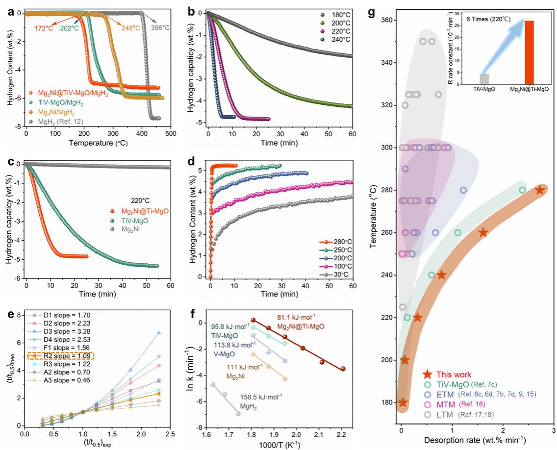 图 2 (a) TPD曲线;(b) 放氢动力学;(c) 220℃下的放氢动力学对比;(d) 吸氢动力学;(e) 动力学模型分析及其 (f) 活化能;(g) 初始放氢速率的对比。