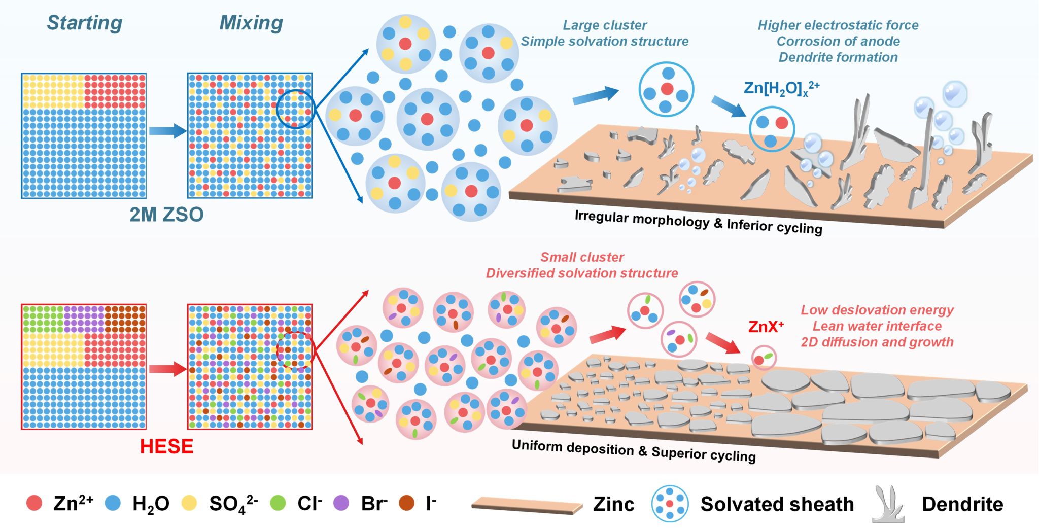 近年来,研究者在高熵合金、陶瓷等先进功能材料研究中对“高熵效应”的认识与创新方兴未艾。受此启发,作者创新性地在水系锌离子电池电解质设计中引入“高熵溶剂化”策略,利用微量混合卤素阴离子的协同介导效应,成功可控构筑出独特的高熵溶剂化结构(图1)。结合原子尺度的理论分析与多维度原位表征技术,深入地揭示了高熵溶剂化结构的体相特征与界面反应演变规律,阐明了锌金属电池综合性能显著提升的关键机制。