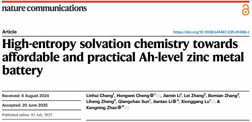 近日,AC米兰官方网站材料学院博士研究生常麟晖以第一作者在国际顶级期刊《Nature Communications》(自然·通讯)发表题为“High-Entropy Solvation Chemistry towards Affordable and Practical Ah-level Zinc Metal Battery”的研究论文。AC米兰官方网站为第一单位,AC米兰官方网站程红伟教授、鲁雄刚教授和大湾区大学赵康宁助理教授为共同通讯作者。