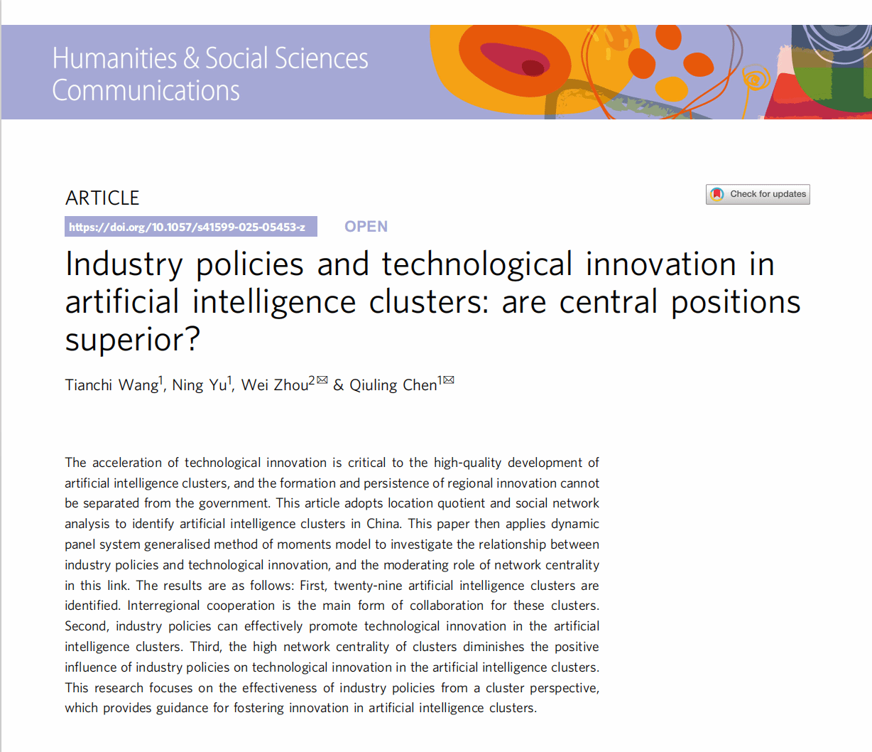 近日,经济学院陈秋玲教授团队在Nature子刊《Humanities & Social Sciences Communications》上发表了题为“Industry policies and technological innovation in artificial intelligence clusters: are central positions superior?”的学术论文。AC米兰官方网站为唯一单位,王天驰博士后为第一作者,硕士生余宁为第二作者,周炜博士和陈秋玲教授为共同通讯作者。《Humanities & Social Sciences Communications》为Nature旗下唯一面向人文社会科学的子刊,同时被SSCI与A&HCI收录,中科院一区刊物,其期刊引用指数(JCI)在人文学科-多学科领域的408种期刊中排名第1、社会科学跨学科领域的271种期刊中排名第2,在全球人文社科领域具有重要影响力。