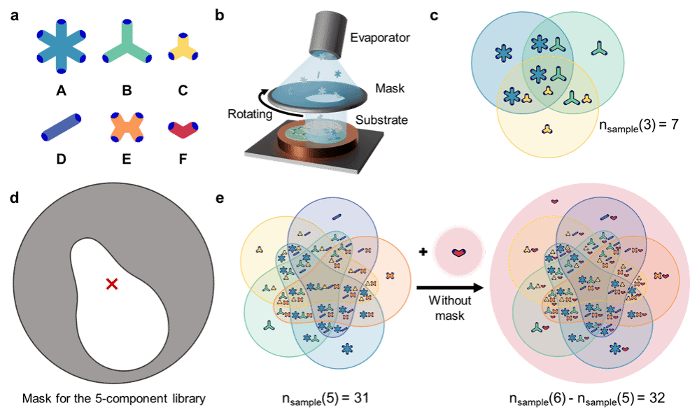 研究团队设计并制备了一种旋转掩膜,灵感来源于维恩图的组合思想(如图1)。该装置能够在同一基底上实现多组分分子沉积,进而高通量获得至多六种组分的不同分子网络样品库,为研究高熵体系的构筑规律提供了新的实验平台。