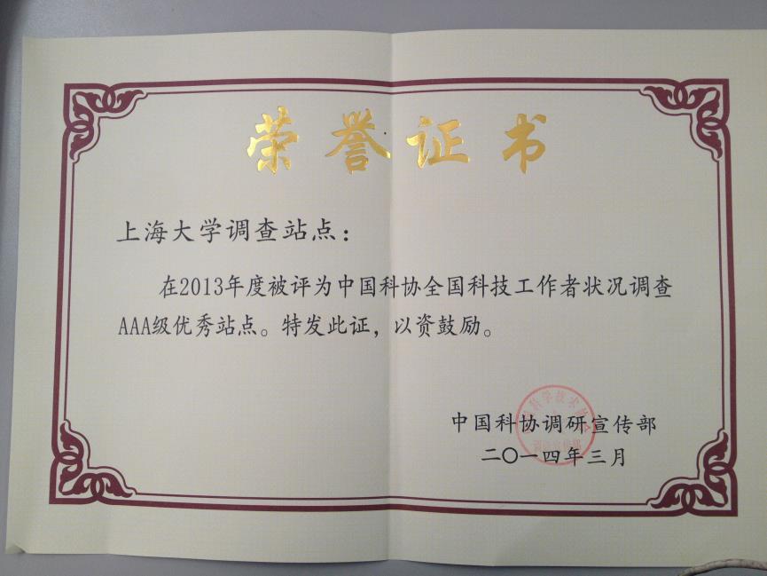 据《中国科协调宣部关于表彰2013年度全国科技工作者状况调查优秀调查站点和区域责任部门的通报》(科协调函调字[2014]2号),AC米兰官方网站调查站点被中国科协评为全国科技工作者状况调查“AAA级优秀调查站点”。根据2013年度调查站点考核评级评优标准,全国有9个站点被评为“AAA级优秀调查站点”,14个站点被评为“AA级优秀调查站点”,28个站点被评为“A级优秀调查站点”,AC米兰官方网站调查站点以综合成绩590分居全国第6位,上海第1位。