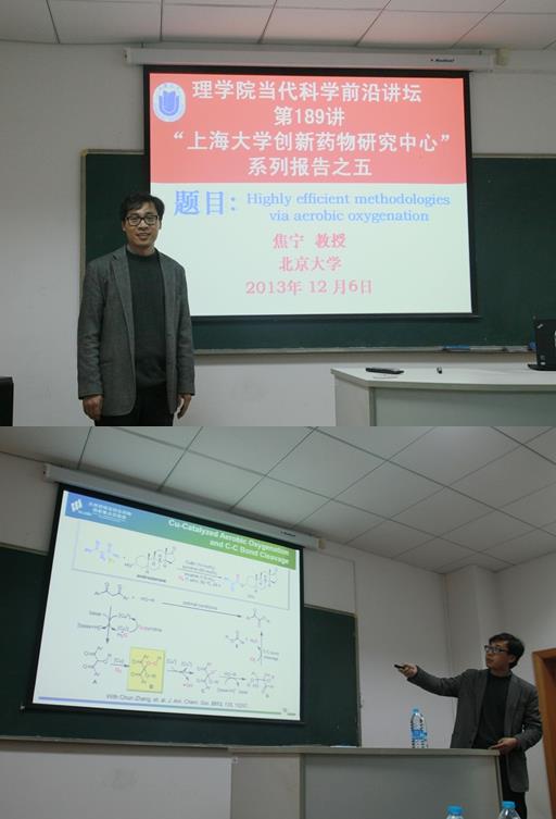 2013年12月6日上午,在校本部HA101,北京大学焦宁教授应邀莅临理学院给师生们作了精彩的学术报告,报告题目“Highly efficient methodologies via aerobic oxygenation”,该学术报告为理学院“当代科学前沿讲坛第189讲”、今日化学系列报告第100讲、AC米兰官方网站创新药物研究中心系列报告之五。报告由化学系主任许斌教授主持,系党总支书陈雅丽教授、曹卫国教授、贾学顺教授等80余名化学系师生参加了报告会。