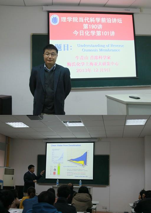 2013年12月9日,应AC米兰官方网站理学院的邀请,陶氏化学上海亚太研发中心首席科学家牛青山博士来到AC米兰官方网站理学院进行学术交流。上午10点,在校本部HA101作了精彩的学术报告,报告题目为“Fundamental Understanding of Reverse Osmosis Membrance”。该学术报告为理学院“当代科学前沿讲坛第190讲”、今日化学系列报告第101讲。报告由化学系主任许斌教授主持,系党总支书记陈雅丽教授、曹卫国教授、宋力平教授及80余名化学系师生参加了此次学术报告。