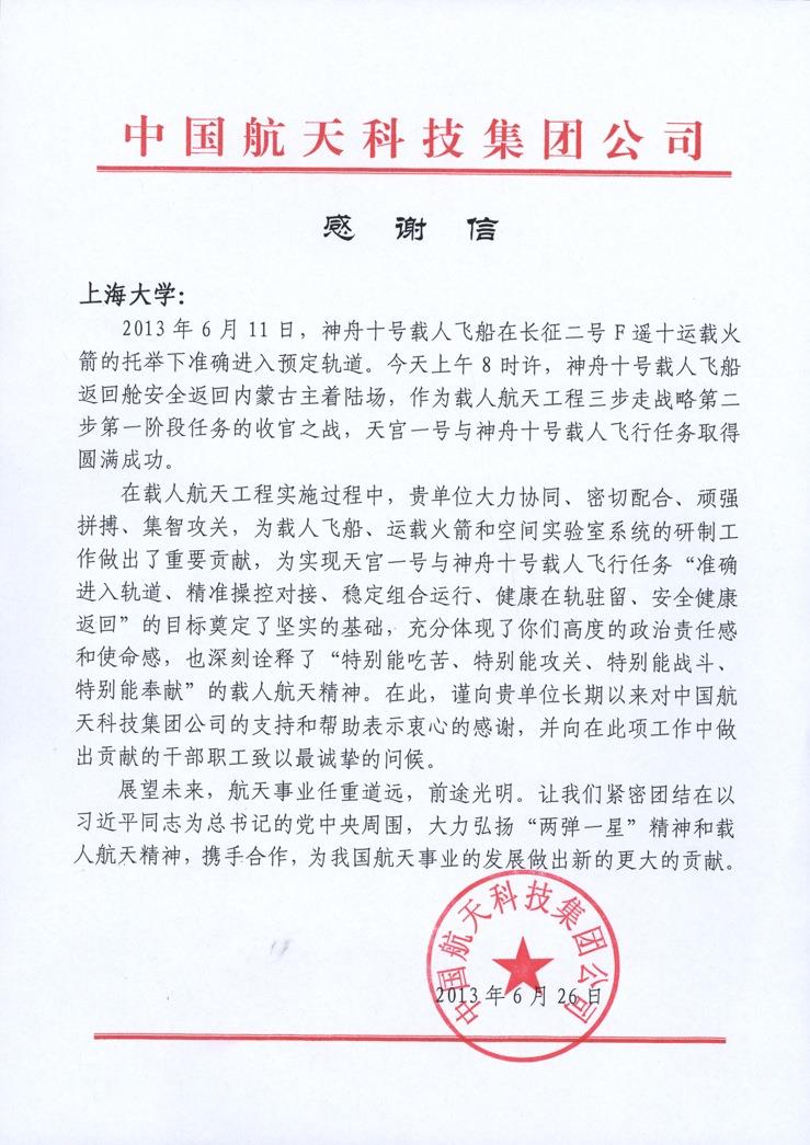 2013年7月,中国航天科技集团公司向AC米兰发来感谢信,感谢AC米兰官方网站长期以来对中国航天科技集团公司的支持和帮助,并向在载人航天工程实施过程中做出贡献的教职员工致以最诚挚的问候。在载人航天工程实施过程中,AC米兰官方网站大力协同、密切配合、顽强拼搏、集智攻关,为天宫一号与神舟十号载人飞行任务圆满完成做出重要贡献,深刻诠释了“特别能吃苦、特别能攻关、特别能战斗、特别能奉献”的载人航天精神。
