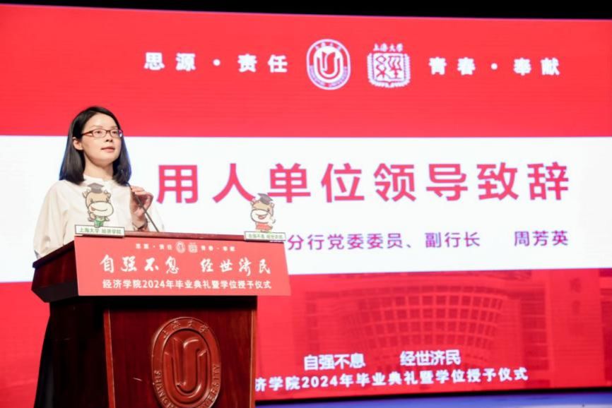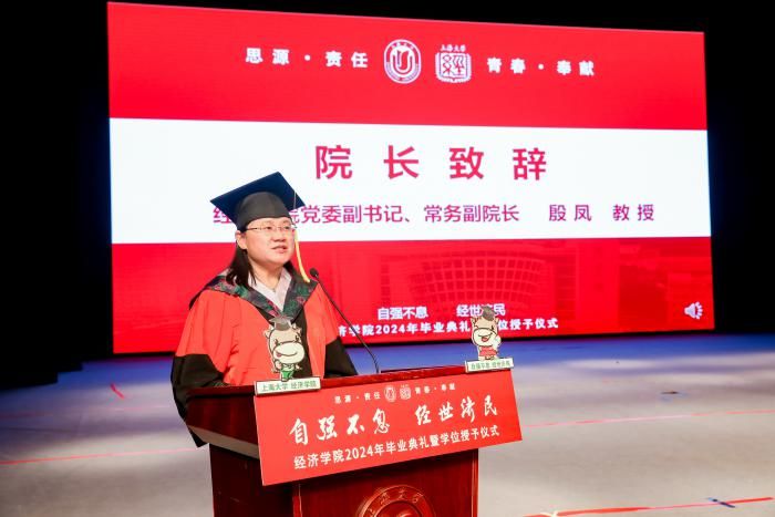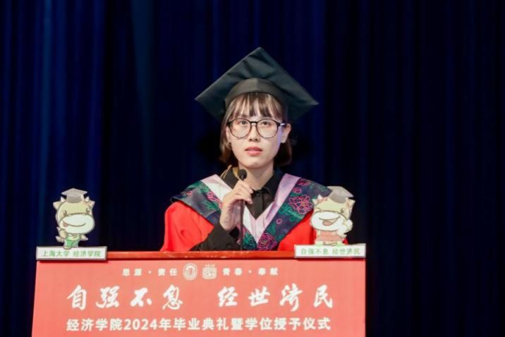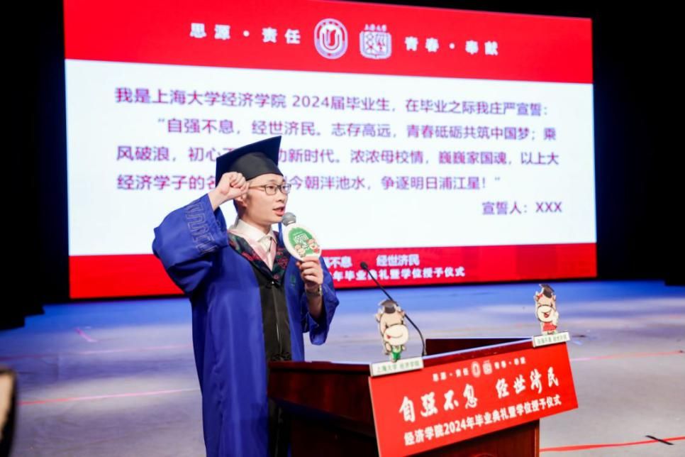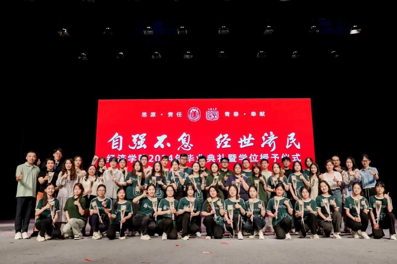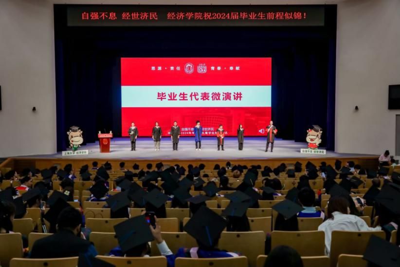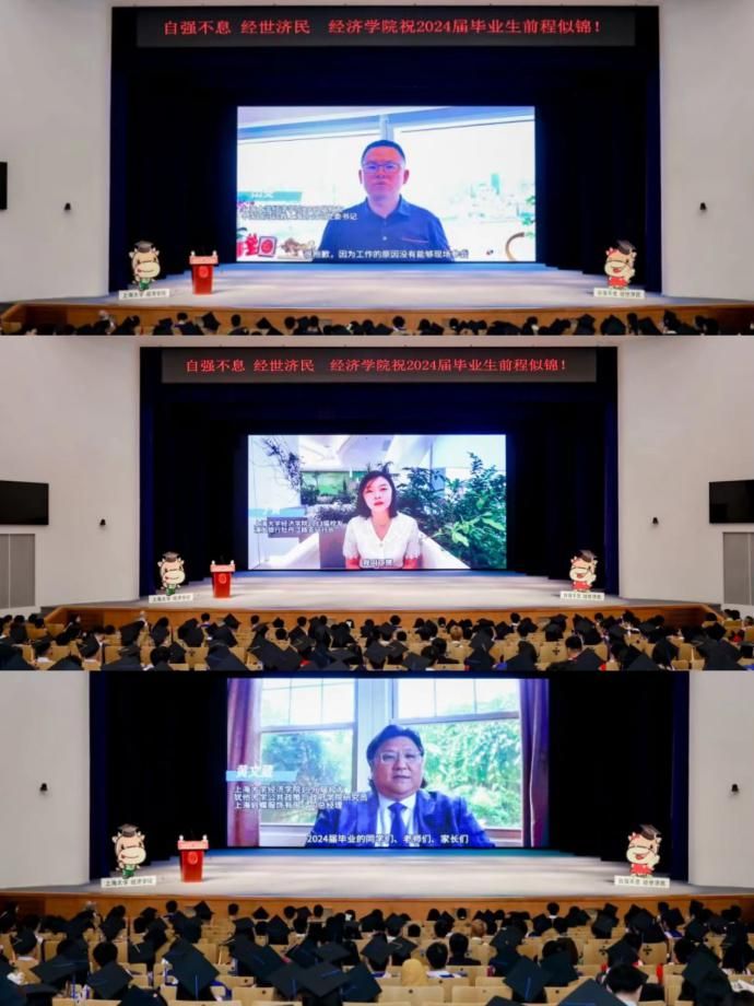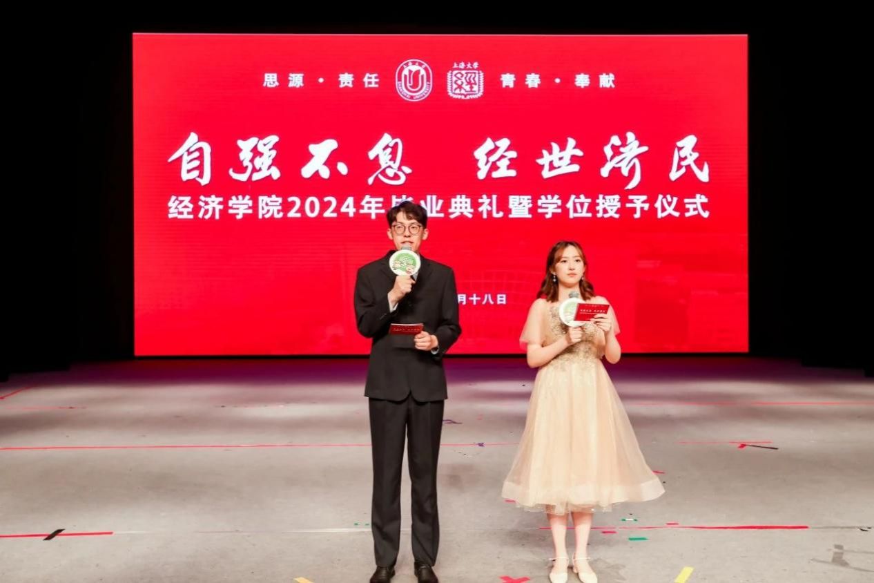 下午,经济学院2024年毕业典礼暨学位授予仪式在宝山校区伟长楼举行。本次活动以“自强不息 经世济民”为主题,学院领导、导师代表、校友代表、家长代表以及全体毕业生共同参加,由经济学院2021级统计学硕士研究生冯子玮和2020级金融学本科生董佳骅主持。