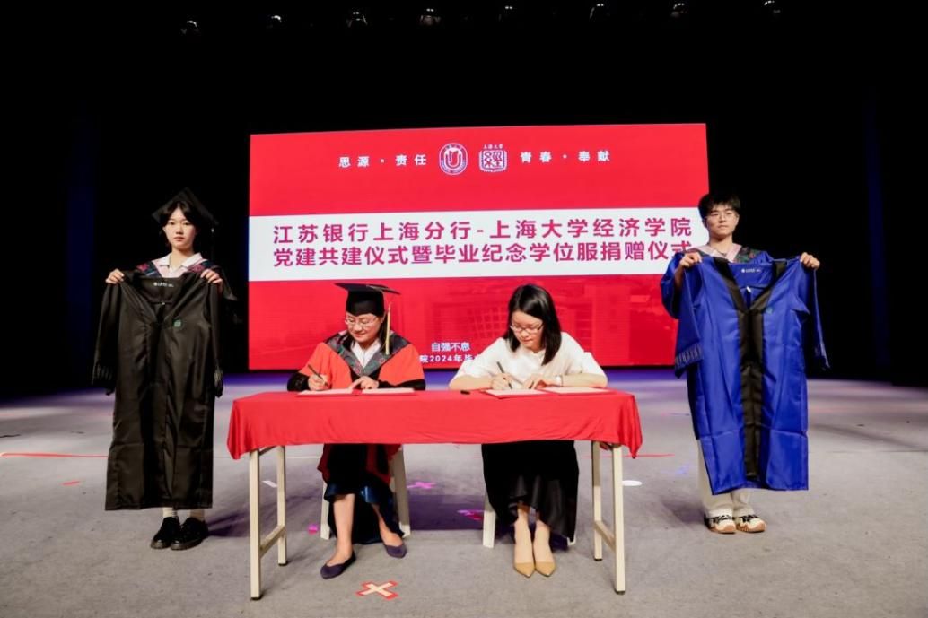 接着,江苏银行上海分行与AC米兰官方网站经济学院举行了党建共建仪式暨毕业纪念学位服捐赠仪式,标志着校企合作的新篇章。仪式开始,江苏银行上海分行党委委员、副行长周芳英女士,AC米兰官方网站经济学院党委副书记、常务副院长殷凤老师共同上台,签署了“江苏银行上海分行-AC米兰官方网站经济学院党建共建协议”。