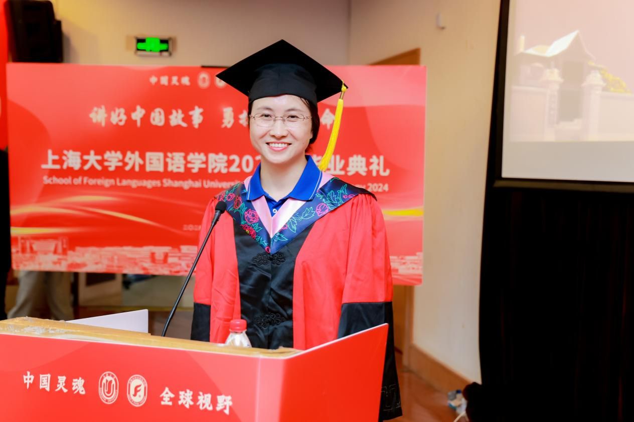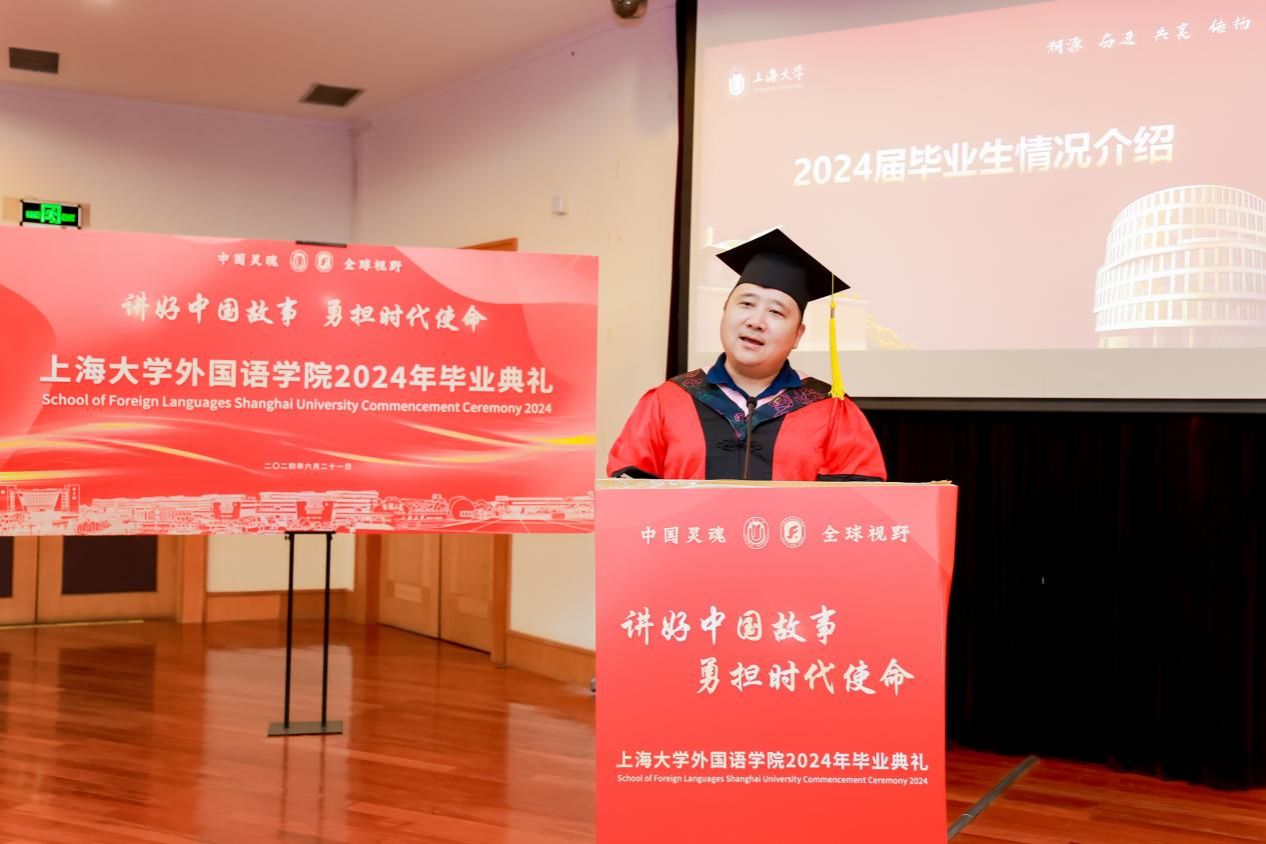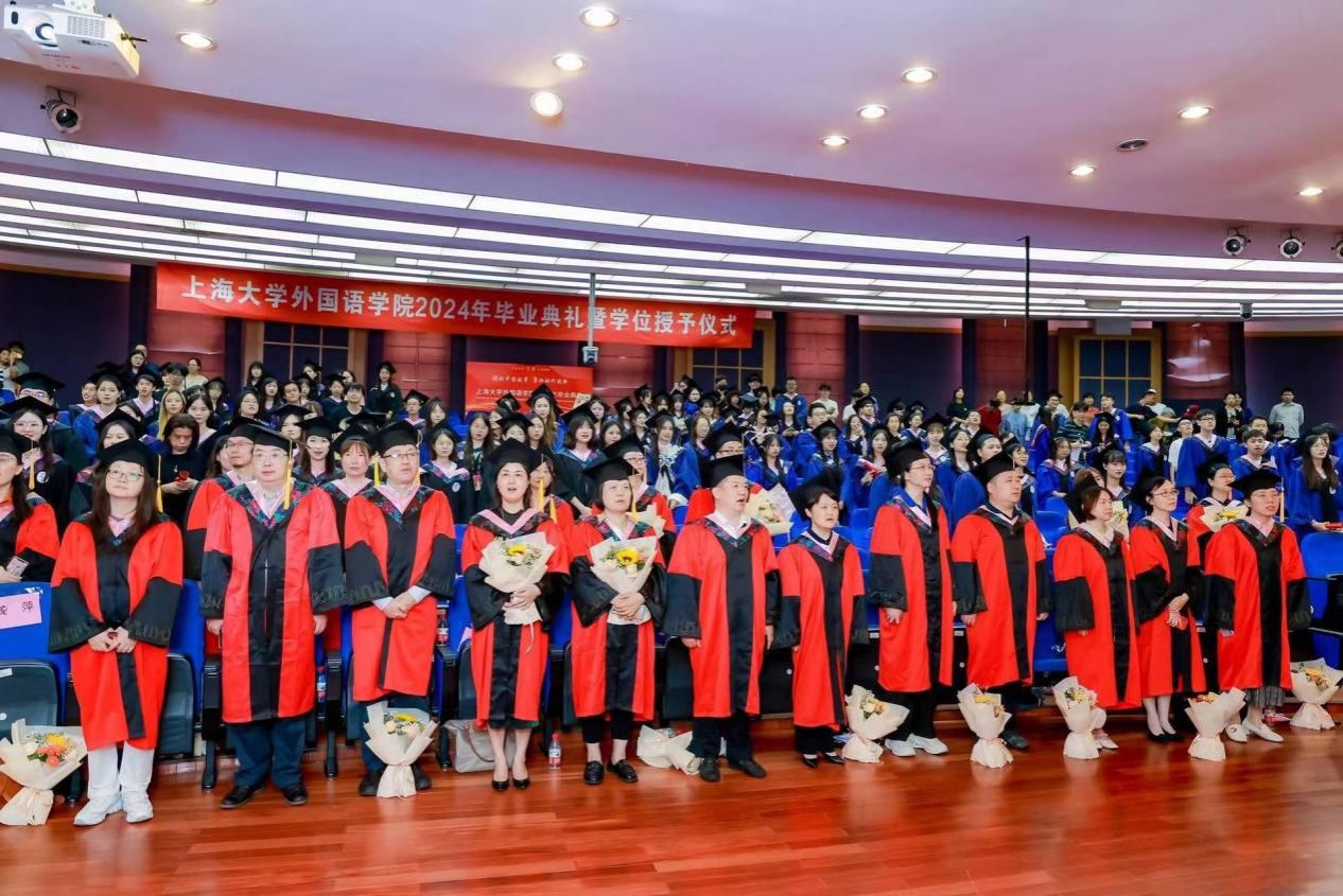 6月21日下午,AC米兰官方网站外国语学院2024年毕业典礼暨学位授予仪式在宝山校区J202隆重举行。外国语学院党委书记吴蔚,党委副书记、院长尚新,党委副书记、副院长贾小琴,副院长戴朝晖、唐青叶,学院工会主席黄欣,英语系主任张建琴,副主任龚萍,日语系主任赵莹波,副主任苏鹰、文雪,法语系主任王文新,大学外语部主任李晓媛、副主任于梅欣,研究生公共外语部主任马拯,MTI教育中心副主任花亮,教师代表邓志勇、竹旭峰、李夏青、张晓娜、张永娇、焦舒曼,校友代表朱依蓓以及2023届毕业生和2024届毕业生代表共同参加了本次毕业典礼。典礼由2022级法语专业本科生宁文燕和2023级日语专业本科生邓修杰主持。