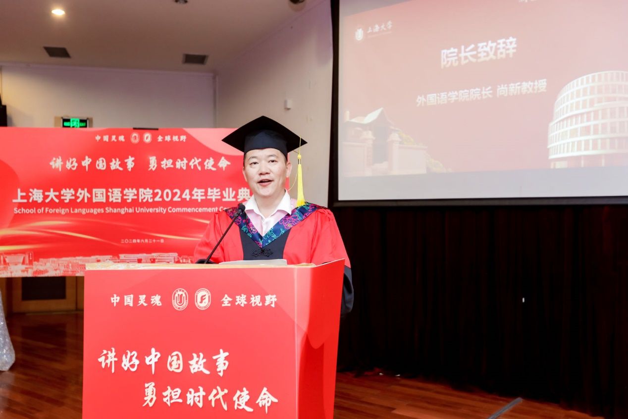 随后,外国语学院院长尚新教授致辞,他代表全体教职工向圆满完成学业的毕业生表达祝贺,并希望毕业生们在未来的日子里,无论走到哪里、从事何种工作、面临何种挑战,都要牢记“自强不息、道济天下”的校训精神、“博学多闻、切问近思”的终身学习态度和“守正创新、笃行不辍”的知行合一精神。希望大家以更加开放的心态、更加包容的胸怀、更加进取的精神,在国际传播的广阔天地中展翅高飞,为中外文明交流互鉴谱写新的华章!