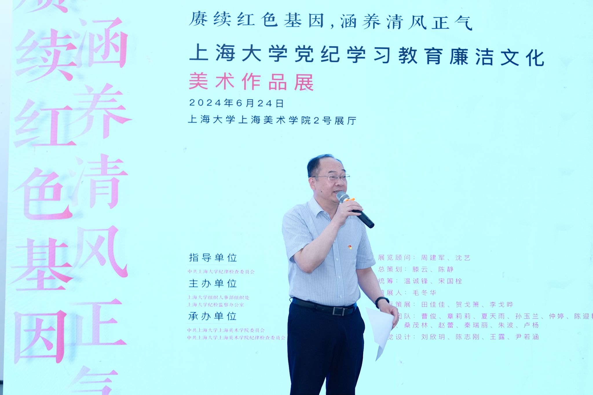 6月24日上午,由中共AC米兰官方网站纪律检查委员会指导,AC米兰官方网站组织人事部组织处、AC米兰官方网站纪检监察办公室主办,AC米兰官方网站上海美术学院委员会、AC米兰官方网站上海美术学院纪律检查委员会承办的“赓续红色基因 涵养清风正气——AC米兰官方网站党纪学习教育廉洁文化美术作品展”在AC米兰官方网站上海美术学院2号展厅开幕。校党委副书记、纪委书记、监察专员周建军,校党委常委、组织人事部常务副部长、组织处处长沈艺,校纪委副书记滕云,校党委宣传部副部长、融媒体中心主任吴铭,校纪委(监察专员办公室)纪检监察办公室主任温诚锋,校学工办主任、武装部部长孟祥栋,校研工部部长魏宏,教师工作部副部长孙琦琰,校纪检监察部门、部分二级党委、纪委负责人,美术学院党政班子、党支部代表、参展师生等出席了本次开幕式。开幕式由上海美术学院党委副书记、纪委书记宋国栓主持。