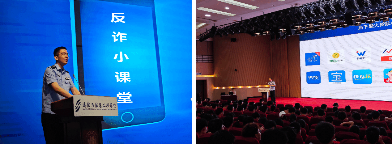 最后,由上海市公安局宝山分局顾村派出所第一责任区警务队队长邓勇为同学们带来防诈骗安全教育讲座。他生动地讲解了电信诈骗的普遍性和复杂性,展示常见诈骗手段和严重案例,提醒学生保护个人信息,不轻信陌生电话和短信,不点击不明链接,并及时与家人、朋友或辅导员沟通,强调学校和家庭在防范诈骗中的重要性。