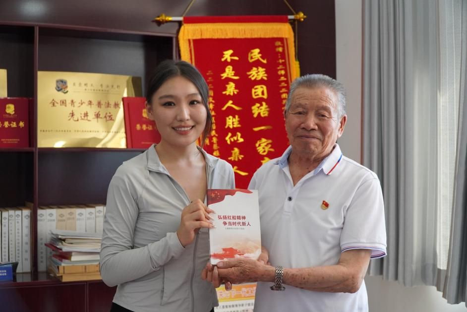 兵团第十二师二二二团老战士甘大国为实践团队队长阿丽亚赠送书籍