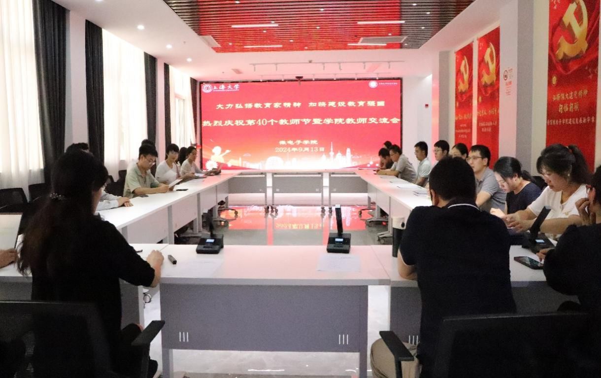 为庆祝第40个教师节,深入学习贯彻党的二十届三中全会精神,学习贯彻习近平总书记在全国教育大会上的重要讲话精神和校第四次党代会精神,9月13日,微电子学院在嘉定校区微电子学院A楼101会议室开展“大力弘扬教育家精神,加快建设教育强国”教师交流会。学院党委副书记、副院长袁铭,副院长胡挺、周婷、路秀真、徐韬以及学院全体教师出席交流会,学院党委副书记余丽娜主持会议。