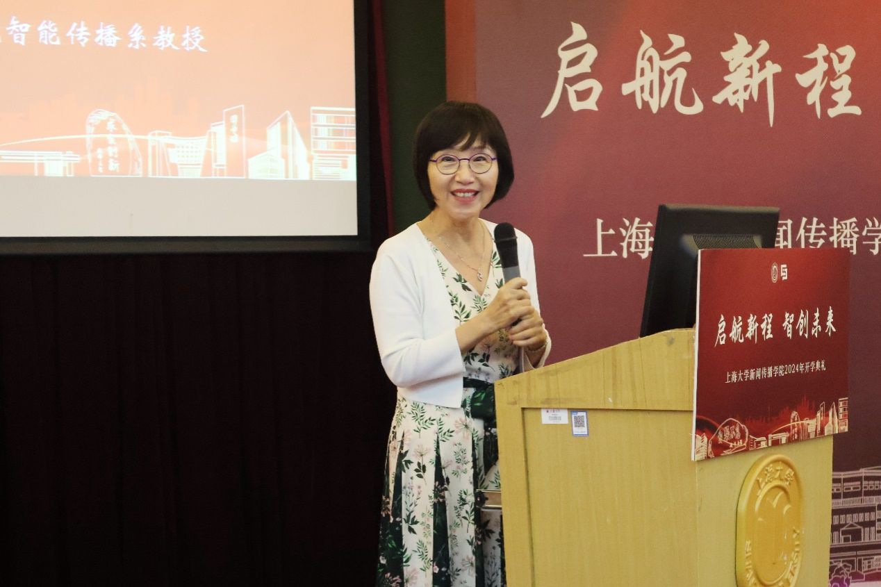新闻传播学院智能传播系教授刘幼琍老师作为导师代表在典礼上发言。她认为,在这个人工智能时代,我们要利用人类洞察力、分析能力和创造力来并引导AI的发展,坚持学术与实践并重。通过分享Thomas Arkle Clark的"If I Were a Freshman Again"这篇文章,她启发大家思考如何重新规划大学生活,鼓励大家珍惜现在,思考未来,并用“Perseverance and passion never fail”来激励大家。同时,她也提醒大家应该总是提高对自我的要求,无论是学习、工作还是生活,付出更多一点,这样不仅能取得更好的成果,还能体验到更多的快乐。