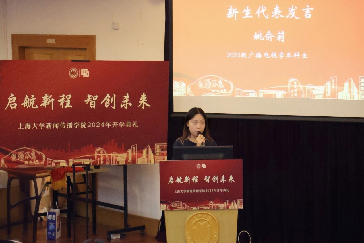 典礼上,新生代表们也与大家分享了他们进入新闻传播学院学习的喜悦与期许。2023级广播电视学专业本科生姚俞莉表示,面对传媒行业的数字化变革,新闻传播学子肩负着传承文化、传播信息、引导舆论的使命。不仅要增强政治敏锐性和社会责任感,还要提升专业素养和创新能力,成为信息洪流中的引领者,用智慧和激情照亮新闻传播的道路。