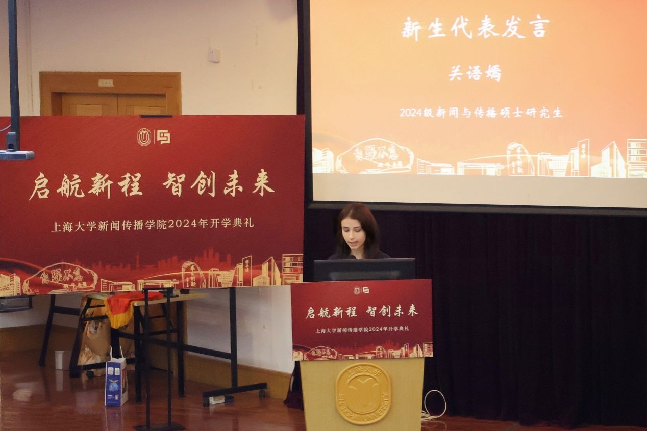 国际学生新生代表、来自俄罗斯的2024级新闻与传播专业硕士研究生关语嫣分享了她如何被中国文化吸引,决心学习中文的故事。这段经历让她感受到了文化传播的力量,并期待着能够为文化传播做出自己的贡献,帮助不同文化背景的人们相互理解、交流,传播真实、客观的信息,促进不同国家和民族之间的相互理解。