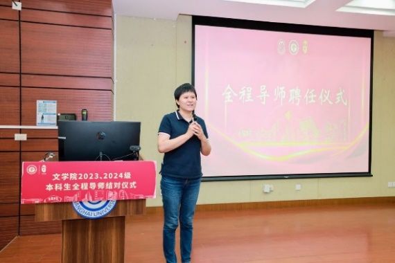 随后举行师生结对仪式,分别由2023级本科生代表和2024级本科生代表为各自年级的导师代表送上绿植并合影留念,希望桌案上这一抹绿色能为导师驱散疲惫,也代表着学生的敬意与感谢。顾甦泳老师作为2023级学生全程导师代表,向同学们分享了鲁迅先生在作品《导师》中的一段话,给予同学们勉励与动力。2024级学生全程导师代表,文学院副院长杨长云老师则对同学们的未来提出了要求与期待,他希望同学们能够珍惜学校提供的学习和发展机会,好好享受在文学院学习生活的时光,实现自己的梦想,也希望老师们能够在做人、做事、做学问方面进行尽心尽力,做好人文关怀,带领同学们实现梦想。