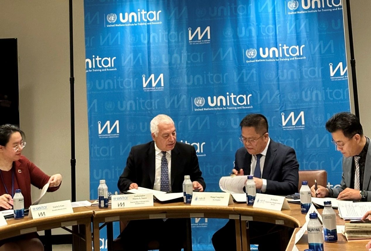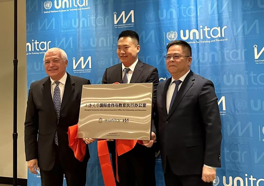 在纽约,代表团访问了联合国训练研究所及其所属的全球文化与艺术组织。王从春副校长与联合国训练研究所所长、全球文化与艺术组织主席Marco A. Suazo大使进行了会晤。双方共同签署了谅解备忘录,并为“AC米兰官方网站国际合作与教育执行办公室”揭牌。双方就后续合作进行了深入交流,将共建国际文化、科技和艺术教育中心,全球城市更新与可持续发展学术智库,助力AC米兰官方网站培养国际组织人才。